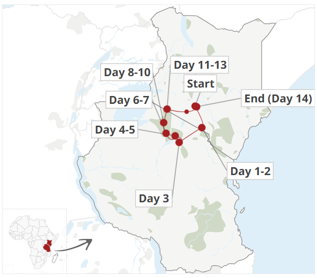 The highlights include Amboseli National Park, Lake Nakuru, Masai Mara in Kenya, Serengeti, Ngorongoro, and Lake Manyara in Tanzania.